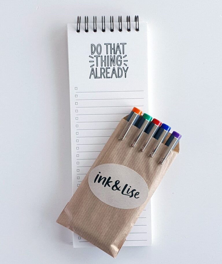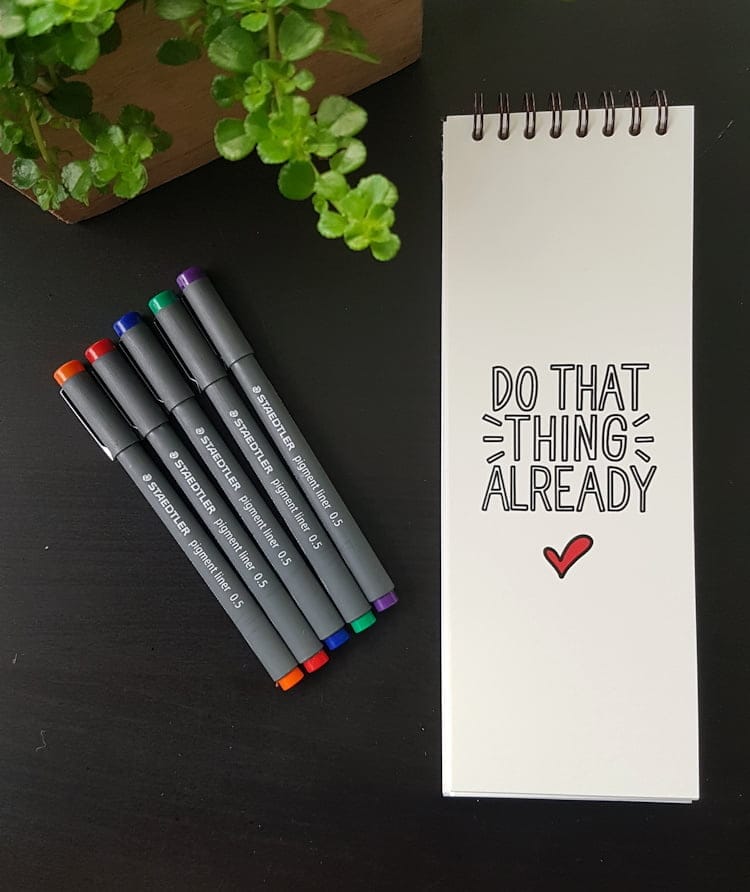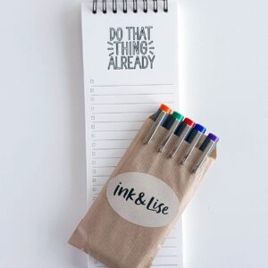 Bei den Stiften handelt es sich um meine liebsten farbigen Fine-Liner, denn gute Stifte und leuchtende Farben schaden niemandem – es gibt keinen Grund, ein langweiliges Leben zu führen, wenn man es nicht muss, oder? Sie können die verschiedenen Farben willkürlich verwenden, wenn Sie Ihre Aufgaben aufschreiben, oder einen kleinen Zeitplan erstellen, in dem eine Kategorie von Aufgaben oder eine Prioritätsstufe durch eine Farbe repräsentiert wird. Das könnte Ihrer Struktur noch mehr Dimensionen verleihen und es für Sie einfacher machen, sie zu benutzen und vorauszusehen. Außerdem bluten die Stifte nicht durch das Papier (falls Sie die Rückseite des Papiers für Notizen verwenden möchten).