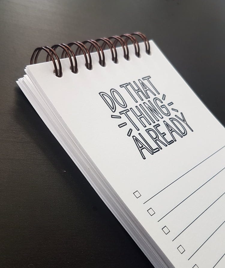 Ich habe dafür Spiralen verwendet, denn es hat einen Sinn, jede Liste aufzubewahren, anstatt sie abzureißen und wegzuwerfen. Wenn Sie auf jeder Seite das Datum oder die Woche angeben, für die sie gilt, haben Sie eine großartige Dokumentation dessen, was Sie wann getan haben, die Ihnen später von Nutzen sein kann. Außerdem können Sie so festhalten, wie viele Dinge Sie tatsächlich erledigt haben. Das kann für diejenigen von uns, die nie das Gefühl haben, genug getan zu haben, eine tolle Sache sein. Wenn eine Liste voll ist, drehen Sie einfach die Seite um, markieren sie mit einem Datum und beginnen eine neue Liste, indem Sie die Aufgaben eintragen, die auf der letzten Seite noch nicht erledigt wurden. Sie können natürlich auch eine Seite herausreißen, wenn Sie möchten, schließlich handelt es sich um einen Notizblock und nicht um ein Buch.