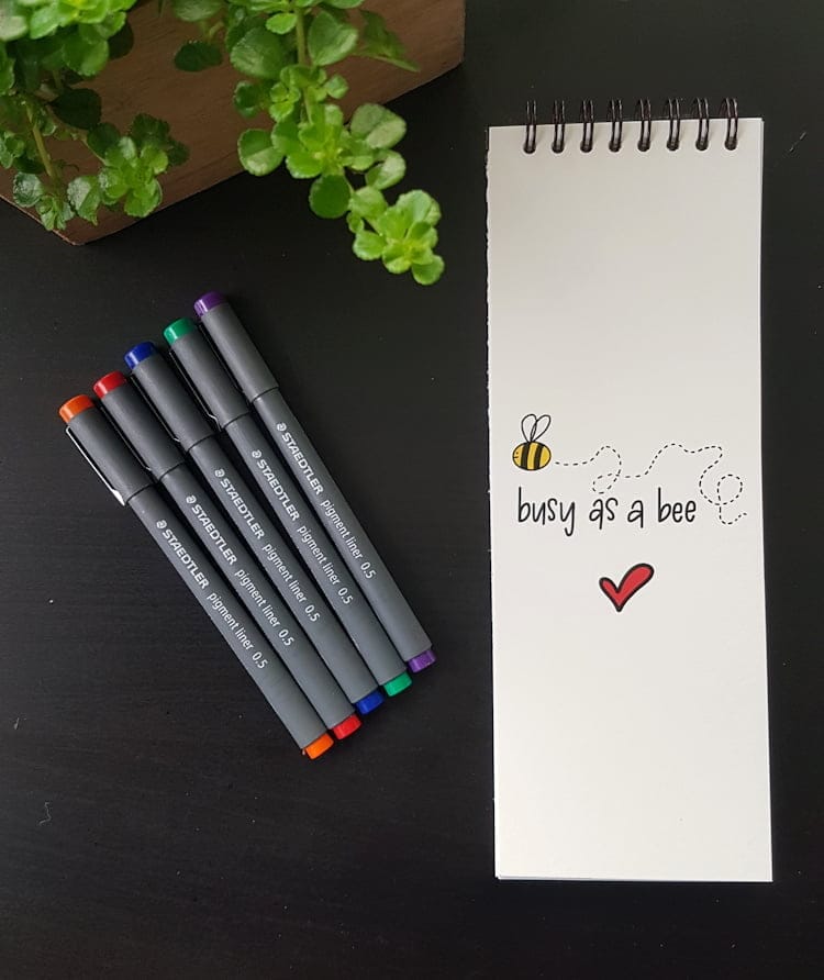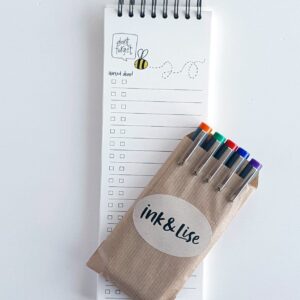Bei den Stiften handelt es sich um meine liebsten farbigen Fine-Liner, denn gute Stifte und leuchtende Farben schaden niemandem – es gibt keinen Grund, ein langweiliges Leben zu führen, wenn man es nicht muss, oder? Sie können die verschiedenen Farben willkürlich verwenden, wenn Sie Ihre Aufgaben aufschreiben, oder einen kleinen Zeitplan erstellen, in dem eine Kategorie von Aufgaben oder eine Prioritätsstufe durch eine Farbe repräsentiert wird. Das könnte Ihrer Struktur noch mehr Dimensionen verleihen und es für Sie einfacher machen, sie zu benutzen und vorauszusehen. Außerdem bluten die Stifte nicht durch das Papier (falls Sie die Rückseite des Papiers für Notizen verwenden möchten).