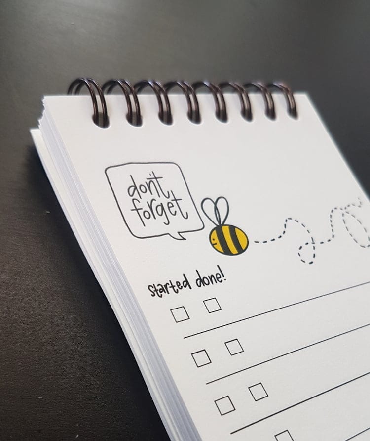 Ich habe dafür Spiralen verwendet, denn es hat einen Sinn, jede Liste aufzubewahren, anstatt sie abzureißen und wegzuwerfen. Wenn Sie auf jeder Seite das Datum oder die Woche angeben, für die sie gilt, haben Sie eine großartige Dokumentation dessen, was Sie wann getan haben, die Ihnen später von Nutzen sein kann. Außerdem können Sie so festhalten, wie viele Dinge Sie tatsächlich erledigt haben. Das kann für diejenigen von uns, die nie das Gefühl haben, genug getan zu haben, eine tolle Sache sein. Wenn eine Liste voll ist, drehen Sie einfach die Seite um, markieren sie mit einem Datum und beginnen eine neue Liste, indem Sie die Aufgaben eintragen, die auf der letzten Seite noch nicht erledigt wurden. Sie können natürlich auch eine Seite herausreißen, wenn Sie möchten, schließlich handelt es sich um einen Notizblock und nicht um ein Buch.