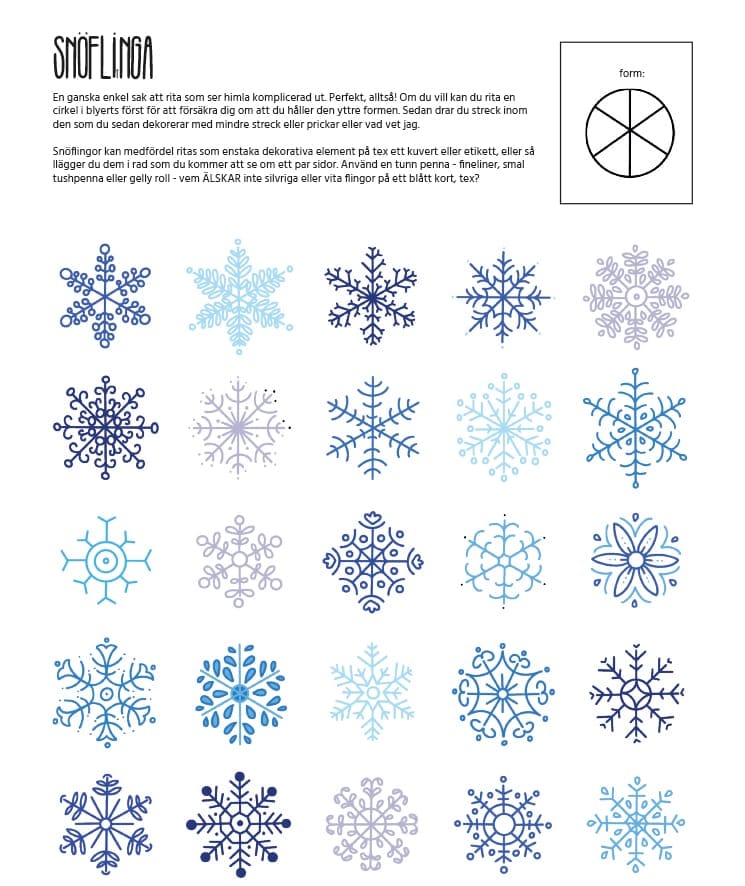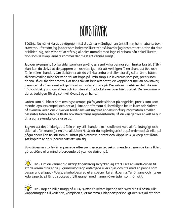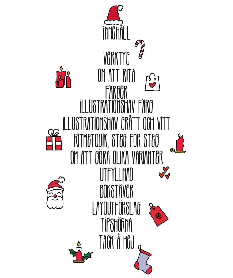 Övningsblad för julkort och etiketter innehåller 33 sidor med inspiration och hjälp för dig som vill rita egna julkort, julklappsetiketter, omslagspapper eller annat med jultema. Jag kan inte rita särskilt bra, du vet ju att jag främst är en bokstavsmänniska, så här finns bara enkla illustrationer som inspiration samt steg för steg övningar, tankar om färg och hur man kan variera samma symboler samt mycket annat. Jag har alltså blandat tips och idéer och mina egna funderingar med en massa ritade, enkla saker för att visa dig att det inte alls är särskilt märkvärdigt att sätta sig ner och rita sig fram till både lite lugn och ett och annat ascoolt julkort. JulMYS en masse!