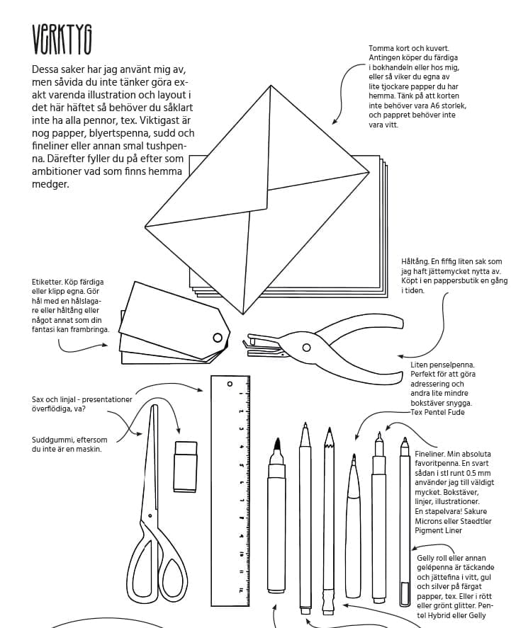 Du kan använda vilka pennor och papper du vill, såklart. Barnens tuschpennor funkar utmärkt, men om du är intresserad, så är det dessa som nämns i häftet: